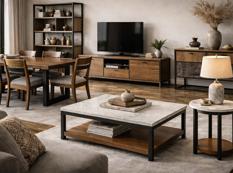 Metal + solid wood + veneer, with marble/resin accents—engineered for strength, balance, and